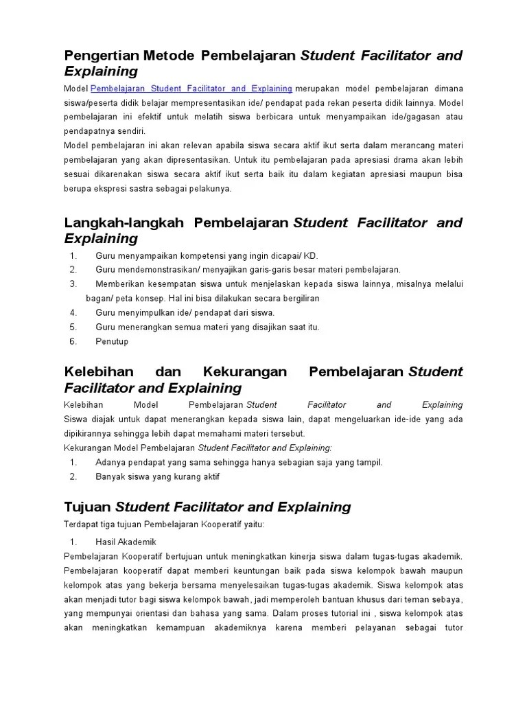 Pembelajaran Kooperatif Tipe Student Facilitator And Explaining - 2 - Cooperative learning student facilitator and explaining student facilitator and explaining is a learning model that allows students to solve .. Penggunaan model pembelajaran kooperatif tipe student facilitator and explaining (sfae) dalam meningkatkan hasil belajar siswa pada mata pelajaran ips kelas . Penerapan model pembelajaran kooperatif tipe sfe (student facilitator and explaining) dengan pendekatan problem solving untuk meningkatkan kemampuan . This study aimed to determine the effect of cooperative learning model student facilitator and explaining on students' mathematical understanding. Pengaruh penerapan model pembelajaran kooperatif tipe student facilitator and explaining (sfe) terhadap penguasaan konsep peserta didik kelas xi sma negeri . Eksperimentasi model pembelajaran kooperatif tipe student facilitator and explaining (sfe) berbantuan alat peraga kotak imajinasi ditinjau dari kecerdasan .
